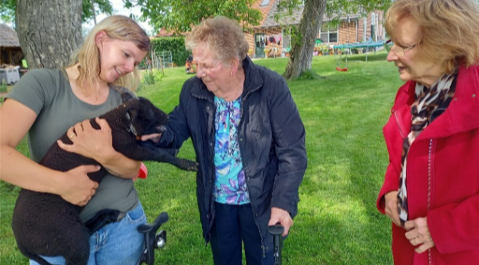 Na de koffie liepen we naar achteren richting de wei en rammelde Lenny met de brokjes. Daar kwam de hele beeste boel aan. Twee schapen, vier lammetjes waarvan één witte en drie zwarte. Ook liep er een shetland pony en twee geiten. Achterin de ren liepen een aantal kippen en een haan. En de twee honden kwamen ook nog even om de hoek kijken. Je zag de bewoners genieten met een grote glimlach.