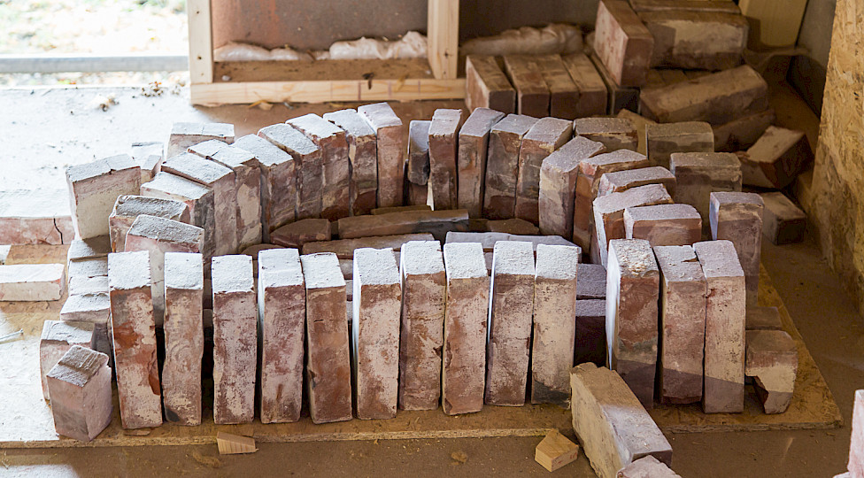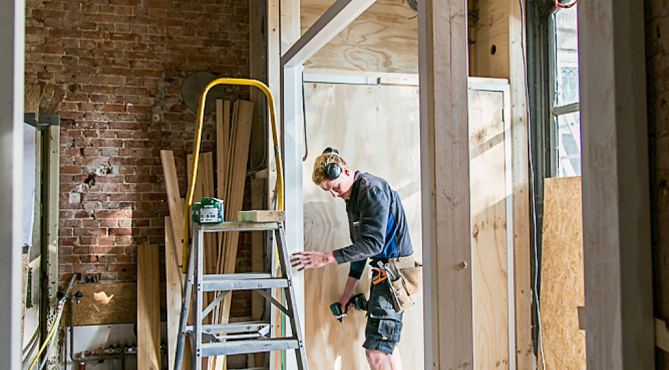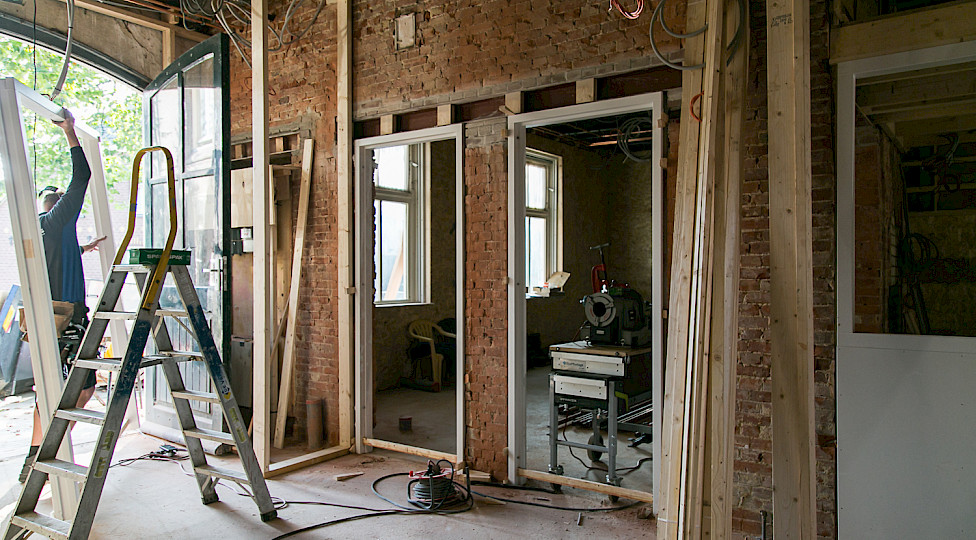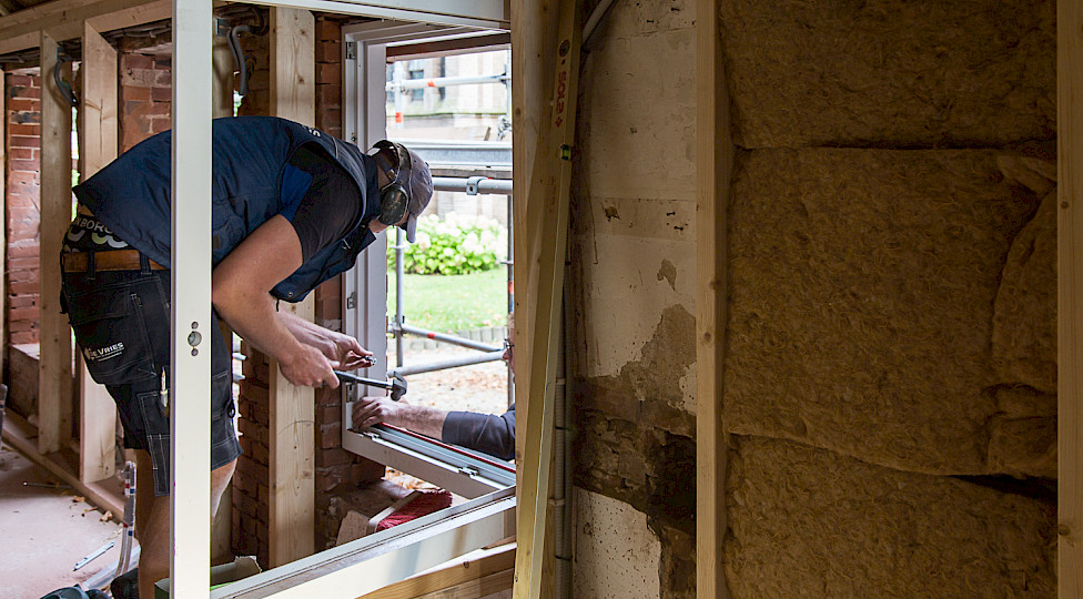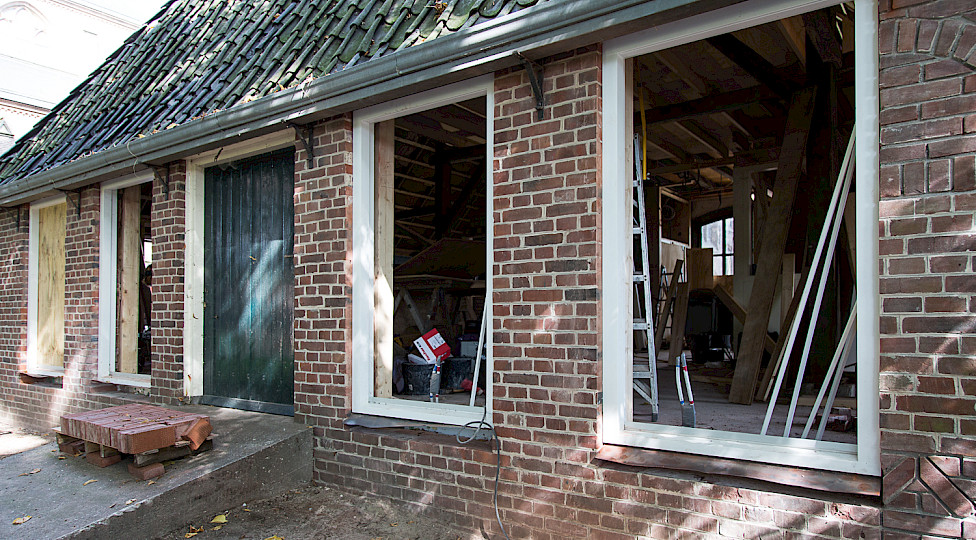 De eensteensmuur is op die plekken uitgezaagd. Om te zorgen dat het gewicht van de kap en de muur erboven opgevangen werd zijn er stalen lateien - draagbalken - geplaatst. Vervolgens zijn de houten kozijnen erin gezet, geschilderd en met een vensterbank afgewerkt. De ramen zijn zo geplaatst dat je de gebinten - de houten draagconstructie van het koetshuis - blijft zien. Aan de Harreveldseweg en tuinzijde komen zes peilkozijnen met vast glas tot aan de grond. Bij de slaapwacht een normaal kozijn. Aan de kerkzijde drie vergrendelbare draaikiepramen, zodat we de ruimte kunnen luchten. Het metselwerk aan de buitenzijde is weer mooi aangevuld volgens het metselverband, een bepaalde manier van metselen. Op een later moment worden de ramen geplaatst met hoogwaardig dubbel isolatieglas.
