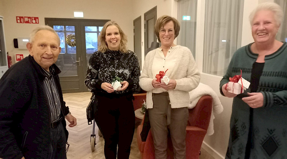 Sinds kort is de stichting Vrienden van Woonzorg Zieuwent opgericht. Op de foto het bestuur v.l.n.r. Bregje Oonk, Karin Knippenborg en Dineke Knol terwijl ze bonbons uitdelen aan meneer Aagten en de rest van de bewoners.