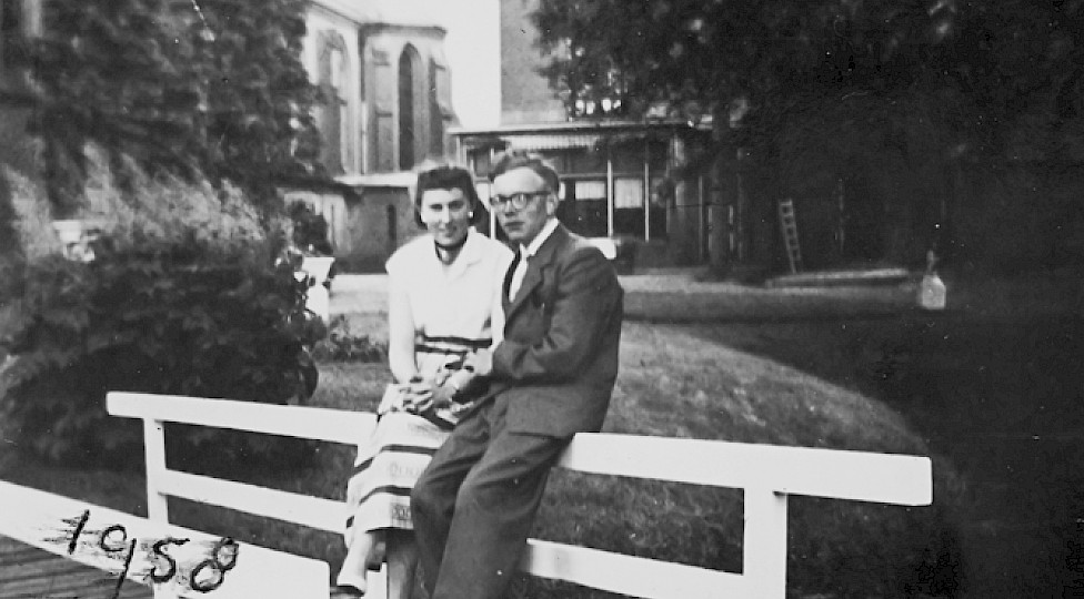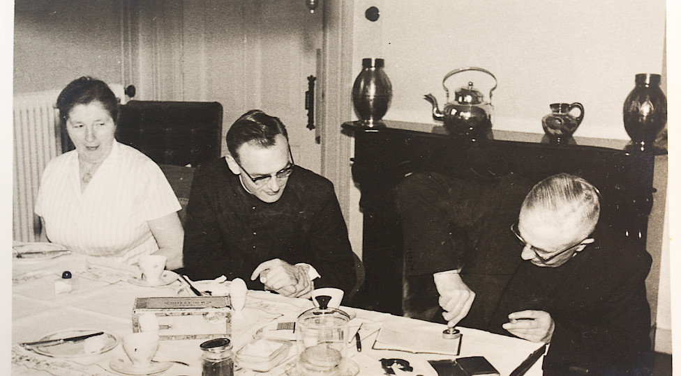 ‘Na de huwelijksceremonie in de kerk, was je als pasgetrouwd stel welkom voor een broodmaaltijd in de pastorie’, vertelt Fiene Vos - Wopereis. Van 1956 tot 1959 was ze het zogenaamde ‘tweede meisje’ en hielp ze pastoor Kaalberg en zijn zus, huishoudster, Marie bij het huishoudelijke werk. ‘Terwijl de aanwezigen alvast naar zaal Bongers vertrokken voor het feest, wandelde het bruidspaar via de doorgang van de kerk naar de pastorie, waar ze welkom werden geheten. Ik dekte de tafel voor het bruidspaar in de werkkamer van de pastoor met een van onze prachtige serviezen. Meestal kookte ik er een eitje bij en de koffie zette ik nog met een ouderwetse percolator.’ Om haar te bedanken voor de maaltijd liet het bruidspaar vaak een fooi achter. ‘Dat stopte ik bij mijn spaargeld waarmee ik voor mijn uitzet spaarde.’ De uitzet wilde ze kopen als ze met Joep Vos zou gaan trouwen. Hij versierde haar tijdens carnaval op vasteloavend in 1957. Wekelijks kwam hij bij Fiene op bezoek in de pastorie, waar ze inwoonde. ‘Als het mooi weer was maakten we een wandeling in de tuin. De pastoor kwam hem altijd begroeten en dan dronken we samen een kop koffie of een glas wijn. Af en toe werd hem zelfs een goede sigaar aangebodendie in een speciale kast onderde warme lampen werden bewaard.’