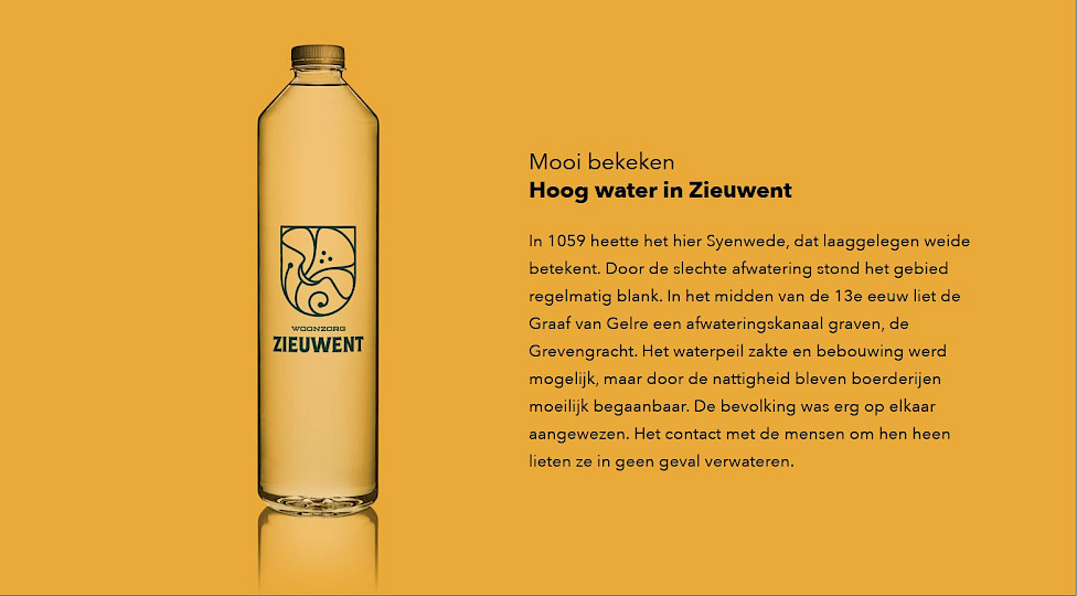 Judith: ‘Tijdens de sessie hoorden we over de bijzondere sterke band tussen de dorpsbewoners, kregen we begrip van de behoefte en de noodzaak van dit initiatief en maakten we kennis met de bevlogen achterban. Vervolgens ben ik op zoek gegaan naar een symbool dat recht doet aan de mooie, karakteristieke stijl van de pastorie (glas-in-lood), die verbinding heeft met de historie van het dorp (vlasblom). Op basis daarvan heb ik het logo en de huisstijl ontworpen. Met Sabine heb ik daarnaast leuke cadeautjes voor de bewoners bedacht, zoals Zieuwents bronwater, omdat water zo’n belangrijke rol speelde in het dorp.’ (zie foto’s)