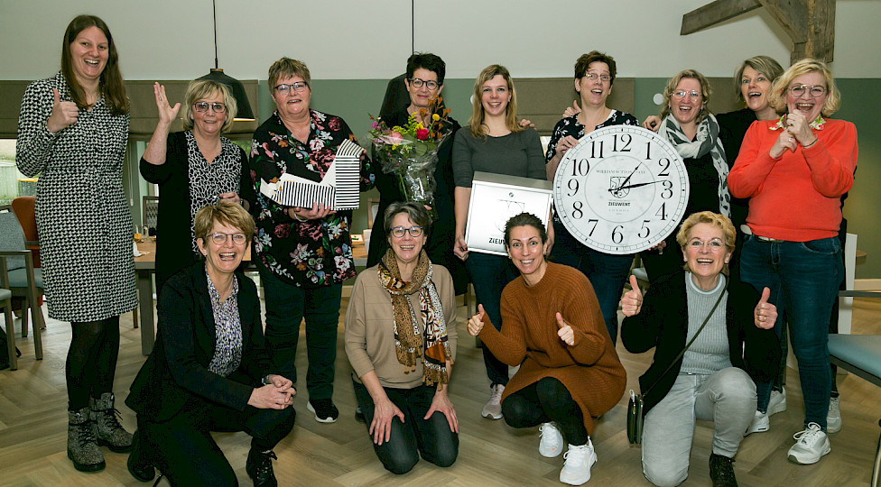Vorig jaar al kreeg Ingrid (bovenste rij, eerste van rechts) van een vriendin de tip om te solliciteren bij Woonzorg Zieuwent. ‘Ze dacht dat het wel iets voor mij zou kunnen zijn. Dat klopte. Vooral het nieuwe vind ik een leuke uitdaging, dus ik besloot te schrijven.’ Van Els Grevers ontving ze een bericht dat het werven van medewerkers even ging duren omdat de verbouwing nog in volle gang was. Ondertussen fietste Ingrid regelmatig met haar vriend langs de pastorie. ‘Er tegenover staat een bankje waar we dan even pauze gingen houden. “Het zal me toch gebeuren dat ik hier mag komen werken”, zei ik dan tegen hem.’